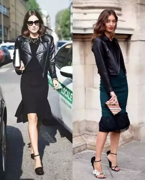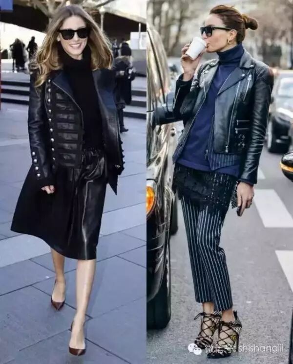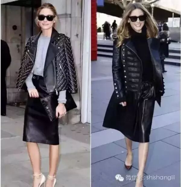 像Olivia这样大胆地用皮衣搭配皮裙也是时髦度爆表,切记上衣的质感颜色款式都要低调低调再低调。▼