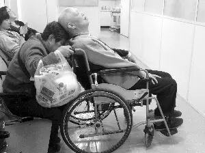 ❤️2015年4月1日,南京鼓楼医院急救大厅,由于轮椅没有头枕,为了老伴睡得更舒服些,潘奶奶用自己的头抵着老伴。