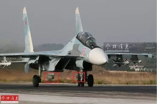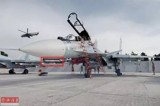 部署在叙空军基地的俄军苏-30SM战机,图中可见除了空空导弹外,苏-30SM还在翼尖挂架配有ECM电子干扰吊舱(红框处)。