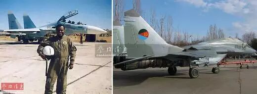 左图为埃塞俄比亚空军飞行员与苏-27UB战机合影资料图,图中可见翼下挂有R-27中距空空弹和R-73格斗弹,右图为厄立特里亚空军装备的米格-29战机。