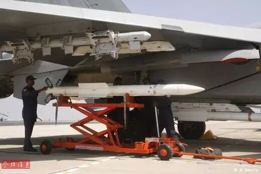 印度空军地勤人员为苏-30MKI挂装R-77中距空空导弹。