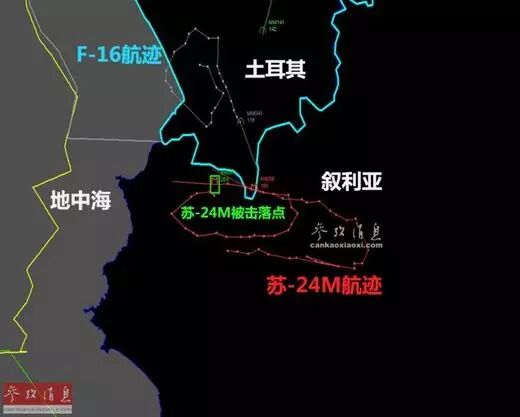 土耳其国防部公布的土军F-16战机与俄军苏-24M战机的雷达航迹示意图。