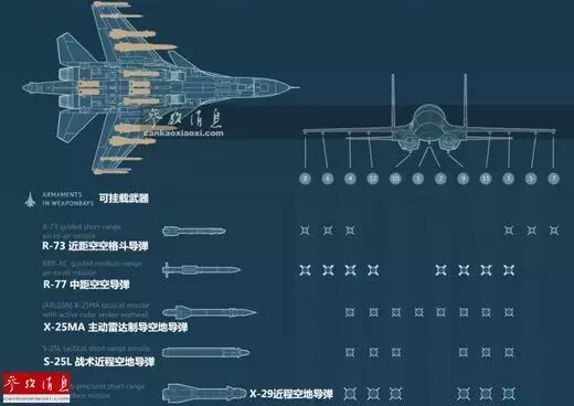 苏-30SM除了有一门30毫米Gsh-30-1航炮外,总共有12个挂点,可挂载总计8吨各种武器弹药。