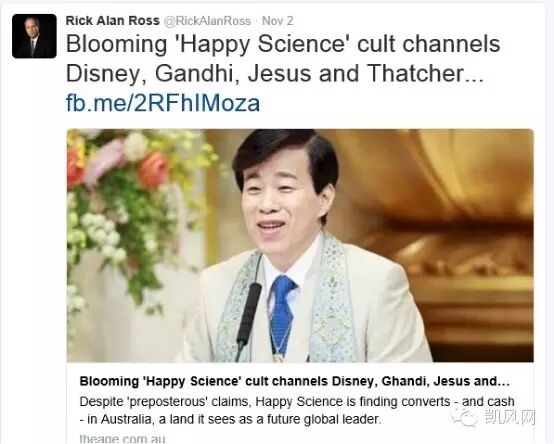 澳大利亚《时代报》网站(Theage.com.au)11月2日报道,日本人大川隆法创办的“幸福科学”(Happy Science)邪教正在澳大利亚墨尔本和悉尼扩大影响,报道同时揭露了幸福科学教的荒诞教义并质疑该教捐款情况。报道的原文标题是《处于蓬勃发展期且能与迪斯尼、甘地、耶稣、撒切尔沟通交流的“幸福科学”邪教》,凯风网全文编译如下: