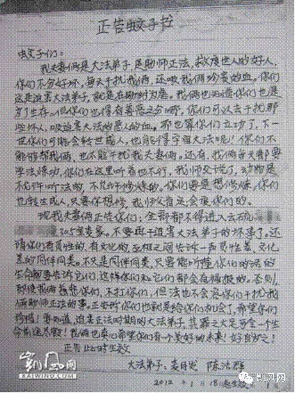 事件回放:凯风网2015年6月29日独家曝光,2012年1-2月,广东省云浮市FLG受害者麦月发、陈洁群夫妇连续发出《正告蚊子书》、《正告蟑螂书》、《正告老鼠书》、《与睡美宝、睡眠之宝、椰海蚊帐沟通》,抗议蚊子、蟑螂、老鼠干扰其修炼“FLDF”。在警告无效后,两人又与睡觉用的床架、床垫、蚊帐交流,要求“宝床”为其提供优质服务、“助师正法”。