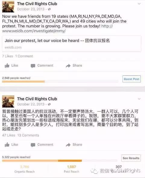回想2013年10月20日,听闻Jimmy Kimmel“杀光中国人”节目之后,便有个想法,觉得,如能借机培养起华人为同胞鼓与呼的习惯,那该多好。美国华人,何不能成为海外华人的标杆,彻底撕开哑裔的标签?于是,在facebook上开了investigatejimmy页面,试探着,看有没有可能发动起全美范围的抗议活动。没想到,很快数千人涌入页面,一千多人报名愿意上街抗议,因此开设的各州邮件组也成了交流的发源平台之一,最终全美范围的抗议成形。这是我第一次无意中“冲入江湖”。很多人在争辩,究竟抗议是否必要。其实,他们不明白,我更多的是想看看,我们的同胞究竟能不能形成不平则鸣的习惯,在全美的范围站出来。小编看到了大家,第一次,真的站出来了。CivilRights微信创办的第一篇第二篇文章,封面全部是不留名不留姓的义工身影,在此向他们再次表示感谢,没有他们,什么事情都不可能做成。
