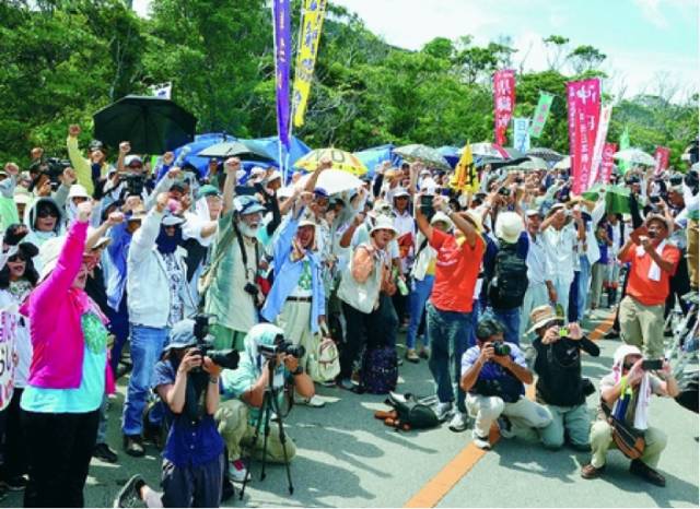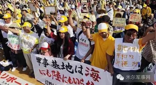 没错,上图中这群愤怒的抗议群众,正是琉球地区抗议驻日美军扩建军事基地的琉球本地人。