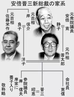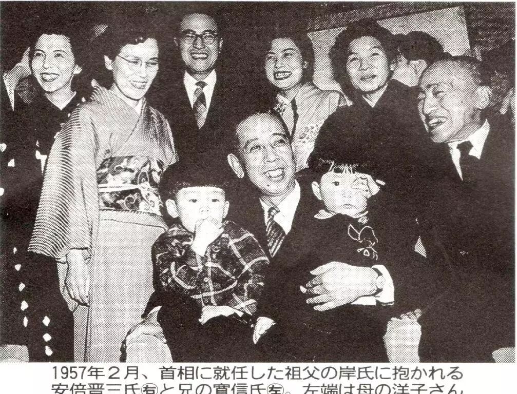 过继,似乎是岸家的传统。岸信介有一子一女,儿子叫岸信和,女儿叫岸洋子。由于哥哥岸信和膝下无子,所以妹妹洋子便把自己的三儿子过继给了哥哥,取名叫岸信夫。岸信夫在2004年成为日本国会议员,继承的是岸信介的票田,而洋子的二儿子,就是日本的现任首相安倍晋三。但是岸信夫直到上大学,才知道自己和表兄安倍晋三,是同父同母所生。