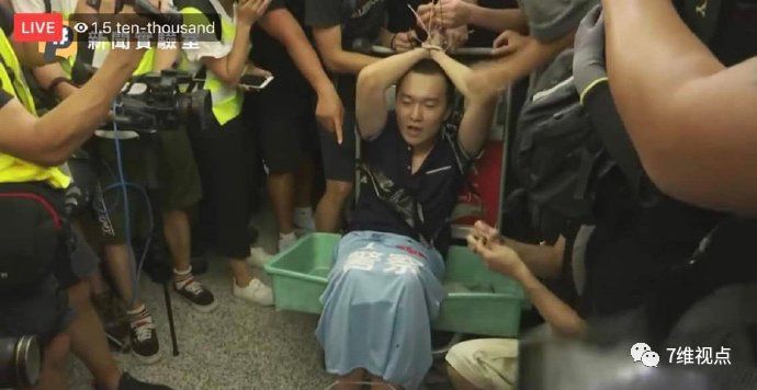 然后,暴徒们又对一名内地记者包围,夺走记者背包进行非法搜查。在搜到一件印有“支持警察”字样的背心后,暴徒们即对记者予以羞辱,然后开始对记者动私刑。先是把记者捆绑,然后凶残殴打。