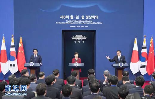 上图:2015年11月1日下午,国务院总理李克强在第六次中日韩领导人会议后,与韩国总统朴槿惠、日本首相安倍晋三共同会见记者。 (新华社记者 王晔 摄)