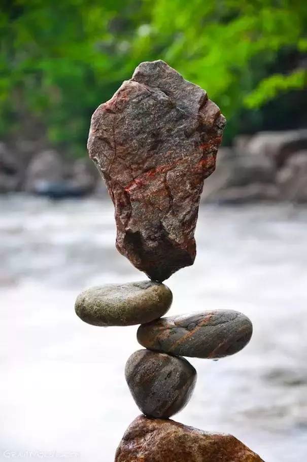 来自加拿大的Michael Grab 是一位天才的平衡艺术家。2002年他到美国科罗拉多读大学,从大学毕业后,他偶然发现了自己在平衡石头方面的兴趣和天赋。从此他便开始利用各种岩石创造惊奇的“岩石平衡艺术”。每一块石块都有各种微小的缺口,Michael Grab 正是利用这些缺口作为支点,之后通过细微调整达到物理的平衡。Michael Grab因此在当地赢得了关注,称自己为“石头平衡艺术家“。