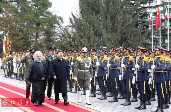 23日,国家主席习近平出席伊朗总统鲁哈尼在萨德阿巴德王宫共和国楼广场举行的隆重欢迎仪式。