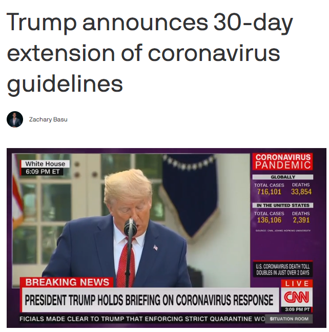 特朗普在周日的记者会上拒绝称复活节最后期限是一个“错误”,声称这“只是一个愿望”。特朗普在记者会上一再强调,两周内会达到美国疫情爆发的拐点。因此,特朗普政府将把指导方针延长到4月30日,以减缓传播速度。