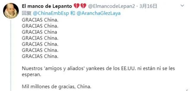 @ElmancodeLepanto:谢谢中国。我们的“朋友及盟友”——美国,既没有帮忙,我们也不指望他们。万分感谢,中国。
