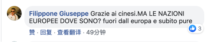 网友Filippone Giuseppe说,“谢谢中国人,(这会儿)欧洲国家又在哪里?”